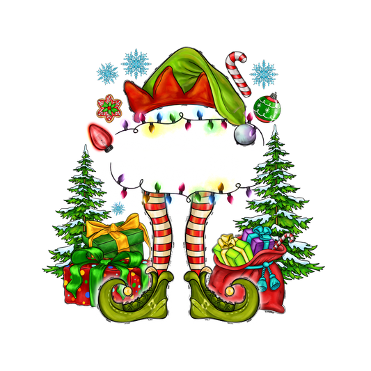 A whimsical Christmas elf design featuring colorful lights, striped legs, and surrounded by festive gifts and evergreen trees.DTF Transfersdtf regular iron