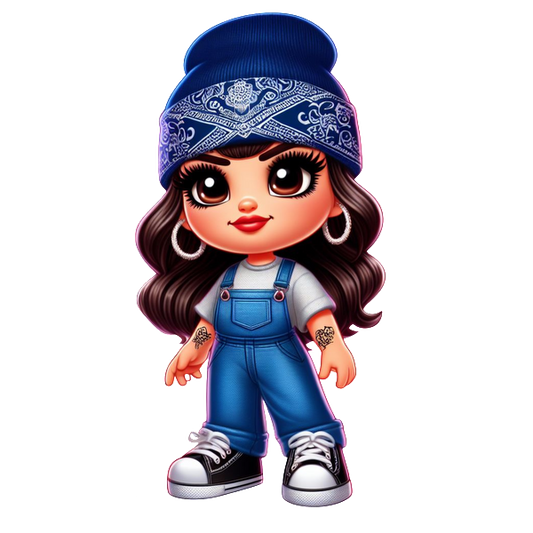A stylish cartoon character with long hair, wearing a blue beanie, overalls, and sneakers, exuding a fun, trendy vibe. heat press transfers