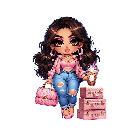 A stylish character with long hair, wearing a pink outfit, holding a drink, and carrying a chic pink handbag. heat press transfers