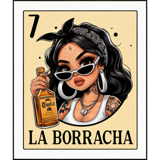 Regular price From £0.75 GBPRegular priceUnit price / per£2.39 GBPSale price From £0.75 GBPA vibrant illustration featuring a stylish woman with sunglasses and tattoos, holding a bottle of tequila labeled "La Borracha." dtf prints