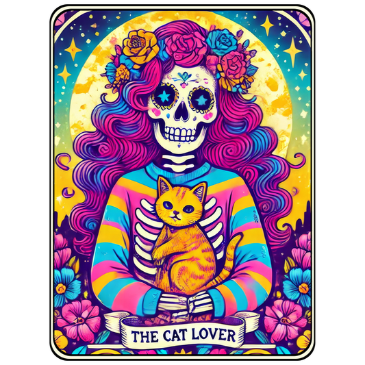 Regular price From £0.75 GBPRegular priceUnit price / per£2.39 GBPSale price From £0.75 GBPA vibrant, whimsical illustration of a skeleton woman in colorful attire, holding a cat, celebrating a love for cats. heat press transfers
