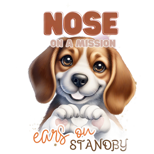 Sweet and playful illustration of a Beagle puppy with a charming expression, featuring the phrase "Nose on a mission, ears on standby."