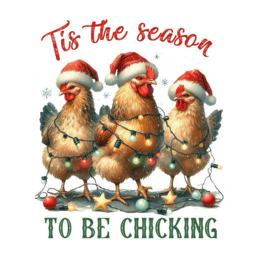 "Our festive trio of chickens, adorned with Santa hats and holiday lights, celebrates the season with charm and cheer!" dtf transfers