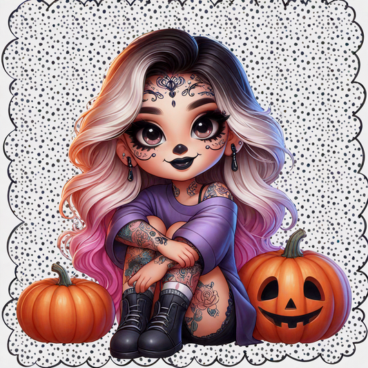 Regular price From £0.75 GBPRegular priceUnit price / per£2.39 GBPSale price From £0.75 GBPThis charming illustration features a tattooed girl with stylish ombre hair, surrounded by playful jack-o'-lanterns, perfect for Halloween vibes.