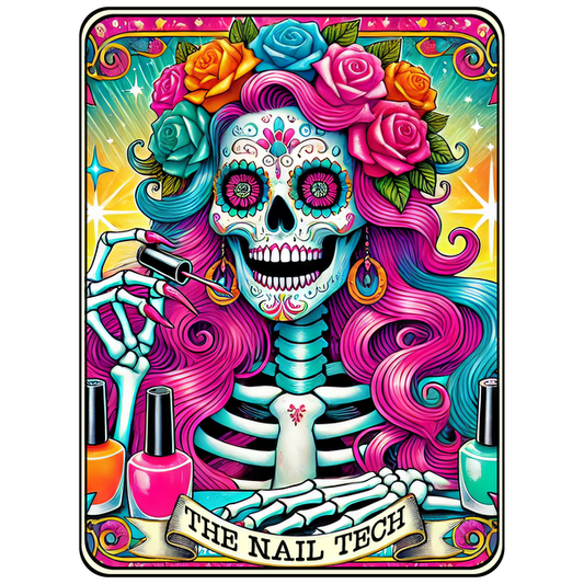 Regular price From £0.75 GBPRegular priceUnit price / per£2.39 GBPSale price From £0.75 GBPA vibrant, colorful skeleton with flowers in her hair showcases nail polish, embodying a playful "Nail Tech" theme.dtf regular iron
