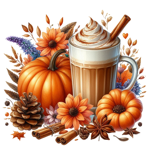 Regular price From £0.75 GBPRegular priceUnit price / per£2.39 GBPSale price From £0.75 GBPA cozy autumn scene featuring a frothy pumpkin spice latte surrounded by vibrant pumpkins and colorful flowers, perfect for fall. heat press transfers