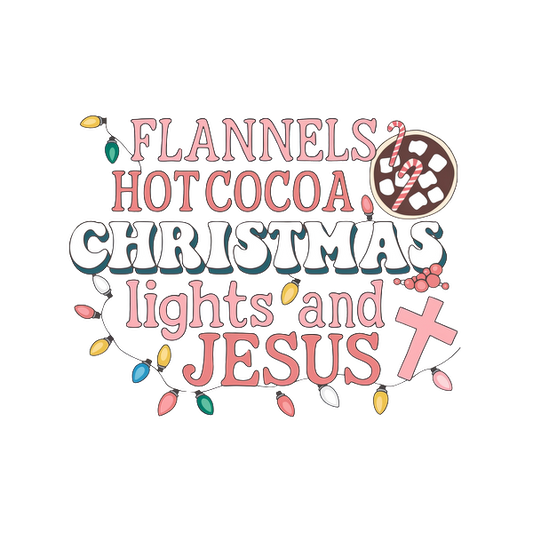 A festive design featuring the words "Flannels, Hot Cocoa, Christmas Lights, and Jesus" with colorful holiday accents. heat press transfers
