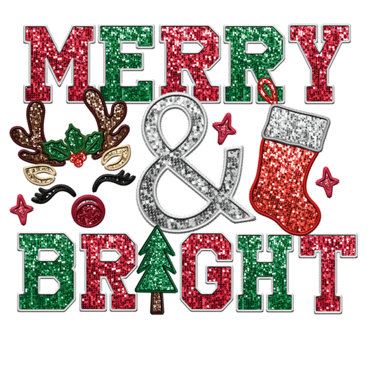 "Celebrate the season with this festive 'Merry & Bright' design featuring glittery letters, a Christmas tree, and playful decorations!"dtf regular iron