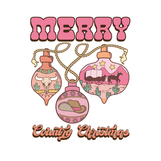 Celebrate a picturesque "Merry Country Christmas" with whimsical ornaments featuring cowboy themes and vibrant colors. dtf prints
