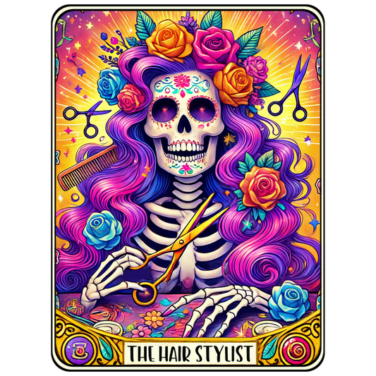 Regular price From £0.75 GBPRegular priceUnit price / per£2.39 GBPSale price From £0.75 GBPA vibrant illustration of a skeleton hair stylist adorned with colorful roses and playful hair tools, celebrating creativity and style. heat press transfers