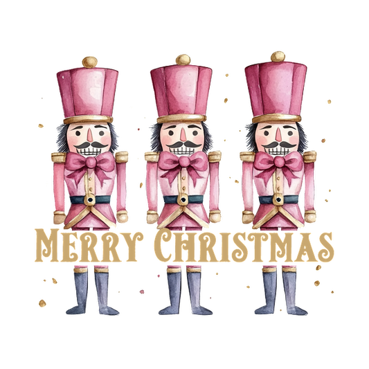 Regular price From £0.75 GBPRegular priceUnit price / per£2.39 GBPSale price From £0.75 GBPFestive illustration featuring three cheerful pink nutcracker soldiers with a "Merry Christmas" greeting below them. dtf transfers