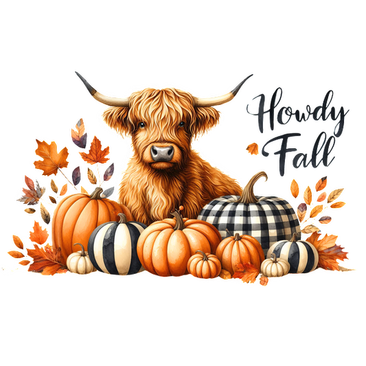 A charming illustration of a Highland cow surrounded by colorful pumpkins and autumn leaves, featuring the text "Howdy Fall." dtf transfers