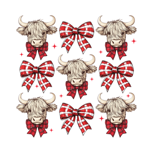 A whimsical pattern featuring adorable cow heads adorned with red plaid bows, perfect for cozy and festive designs. dtf prints