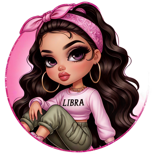 Regular price From £0.75 GBPRegular priceUnit price / per£2.39 GBPSale price From £0.75 GBPA stylish cartoon girl with curly hair and a pink headband wears a "LIBRA" top and trendy green bottoms. dtf prints