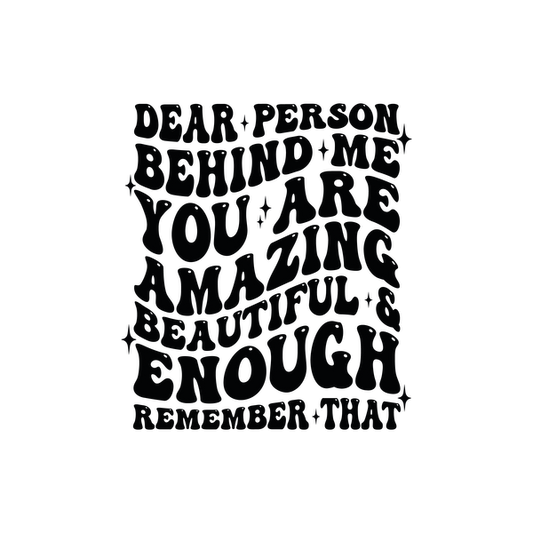 A motivational graphic featuring the uplifting message, "Dear person behind me, you are amazing, beautiful, and enough." dtf transfers