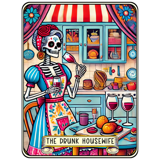 Regular price From £0.75 GBPRegular priceUnit price / per£2.39 GBPSale price From £0.75 GBPA vibrant, artistic depiction of a skeleton housewife enjoying a drink in a colorful kitchen, titled "The Drunk Housewife."dtf regular iron