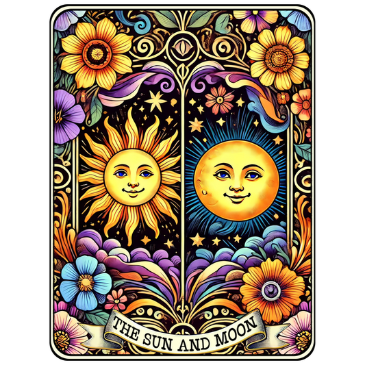 Regular price From £0.75 GBPRegular priceUnit price / per£2.39 GBPSale price From £0.75 GBPA vibrant illustration featuring the sun and moon, surrounded by colorful flowers and decorative elements, titled "The Sun and Moon."dtf regular iron