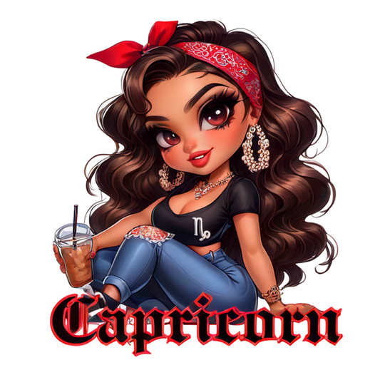 Regular price From £0.75 GBPRegular priceUnit price / per£2.39 GBPSale price From £0.75 GBPA trendy cartoon character with long, wavy hair, a red bandana, and a Capricorn shirt enjoys a drink in casual jeans. dtf transfers