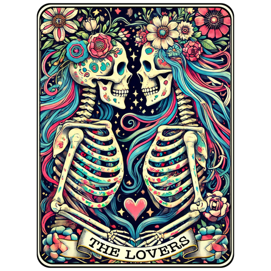 Regular price From £0.75 GBPRegular priceUnit price / per£2.39 GBPSale price From £0.75 GBPA vibrant illustration of two skeletons, adorned with flowers and colorful hair, symbolizing love with "THE LOVERS" text.dtf regular iron