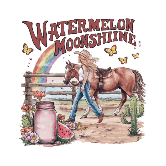 A whimsical design featuring a girl leading a horse, surrounded by flowers, a watermelon jar, and butterflies under a rainbow.dtf regular iron