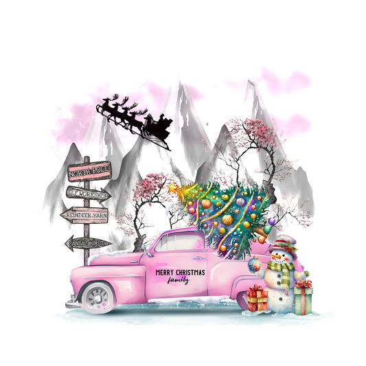 Celebrate the holiday spirit with a charming pink vintage truck carrying a colorful Christmas tree and a friendly snowman! dtf transfers