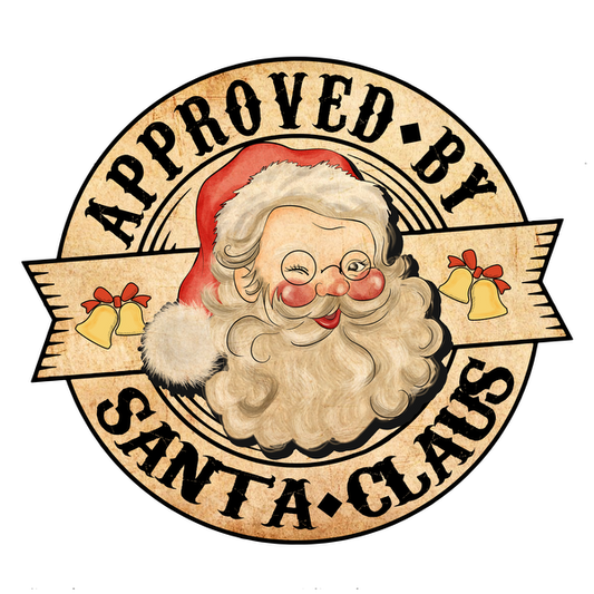 A cheerful vintage-style stamp featuring Santa Claus with a wink, declaring "Approved by Santa Claus" along with festive bells. dtf prints