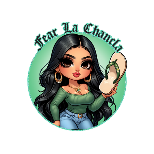 Regular price From £0.75 GBPRegular priceUnit price / per£2.39 GBPSale price From £0.75 GBPA stylish cartoon character holding a flip-flop, wearing a green top and jeans, with long black hair and bold accessories. dtf transfers