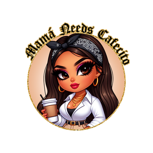 Regular price From £0.75 GBPRegular priceUnit price / per£2.39 GBPSale price From £0.75 GBPA stylish illustration of a woman in a white blouse and bandana, holding a coffee cup with the text "Mama Needs Caffeinito." dtf transfersdtf regular iron