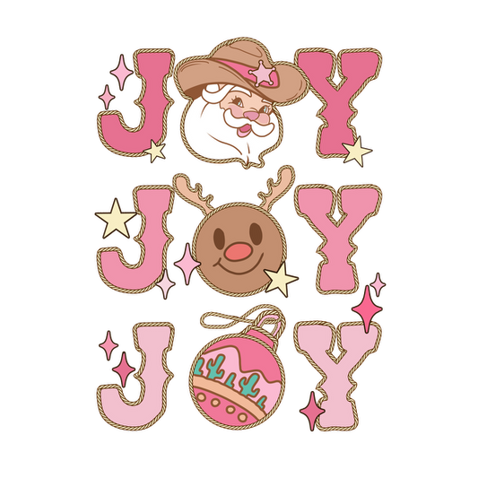 This playful holiday design features cheerful "JOY" text alongside a smiling reindeer, a festive ornament, and twinkling stars.
