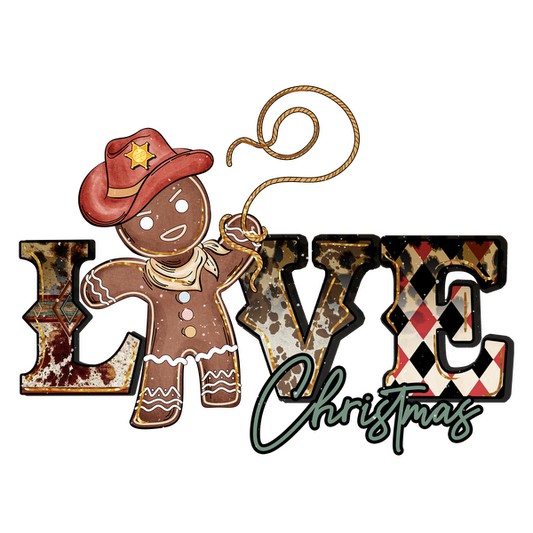 A playful gingerbread cookie dressed as a cowboy adds festive charm to the "LOVE Christmas" design in vibrant colors. dtf transfers