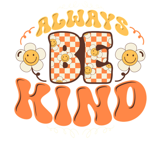 A vibrant and cheerful design featuring the phrase "Always Be Kind" surrounded by smiling flowers and playful typography.dtf regular iron