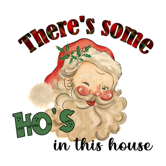 A playful illustration of Santa Claus with a wink, featuring festive text that reads, "There's some Ho's," perfect for holiday cheer. dtf prints