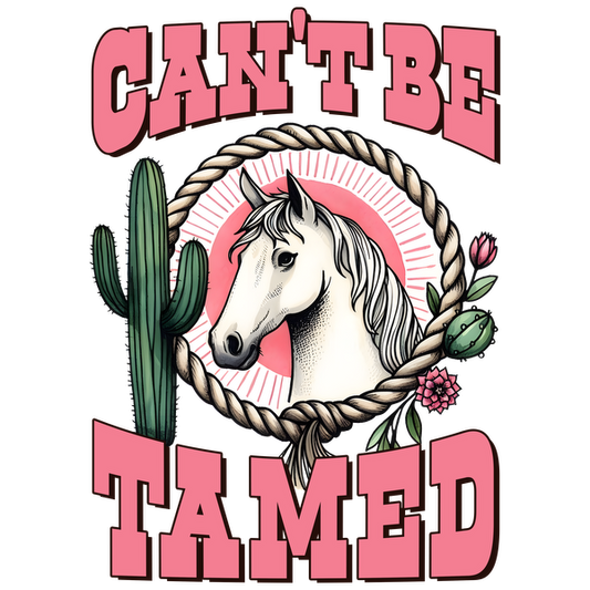 A vibrant graphic featuring a white horse surrounded by cacti and flowers, with the bold slogan "CAN'T BE TAMED." heat press transfers