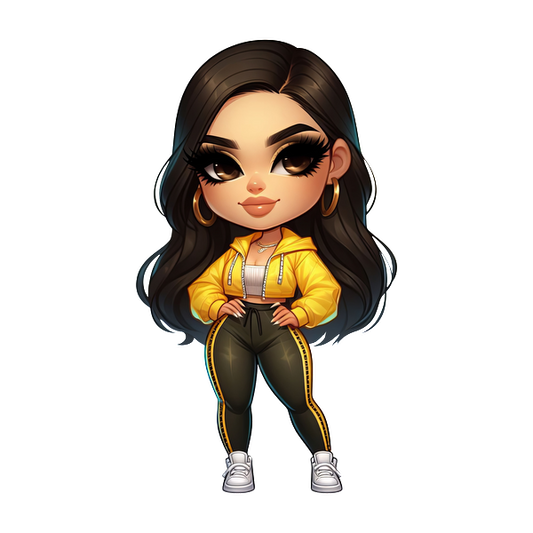 A stylish, cartoonish character wearing a yellow zip-up hoodie, black leggings, and white sneakers, exuding confidence and flair. heat press transfers