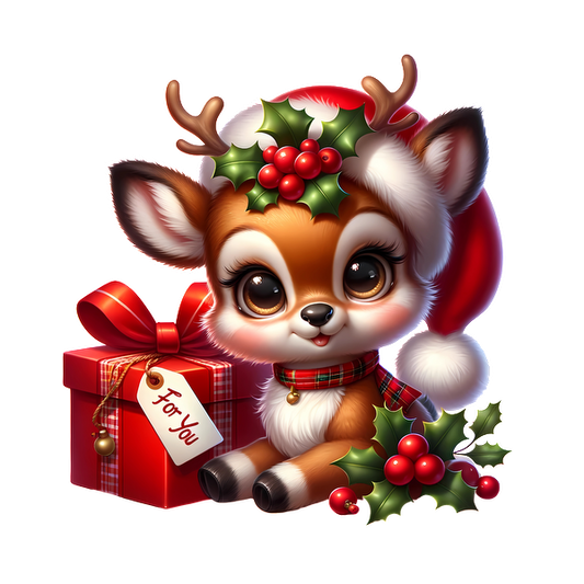 This adorable cartoon reindeer, adorned with a Santa hat and festive holly, sits next to a colorful gift box.