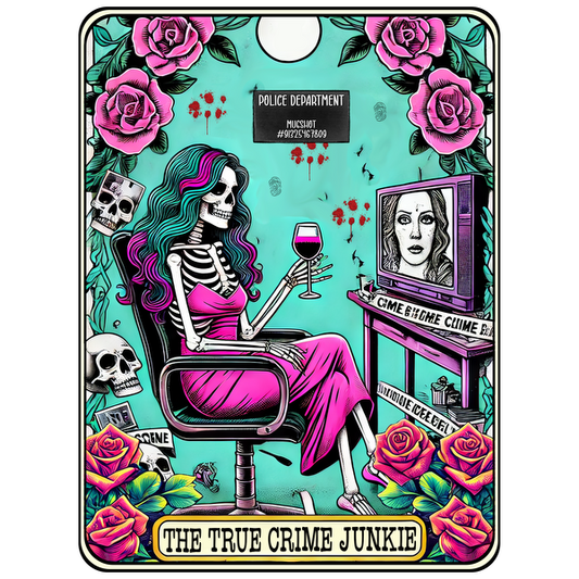 Regular price From £0.75 GBPRegular priceUnit price / per£2.39 GBPSale price From £0.75 GBPA vibrant, quirky illustration features a skeleton in a pink dress drinking wine, surrounded by roses and skulls, celebrating true crime culture.dtf regular iron