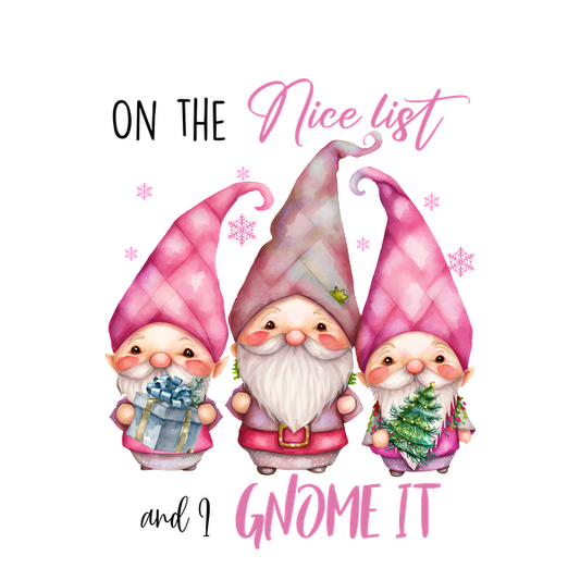 Three cheerful gnomes in pink hats, holding a gift and a tree, surrounded by whimsical snowflakes and the text “Nice List Gnome It.”