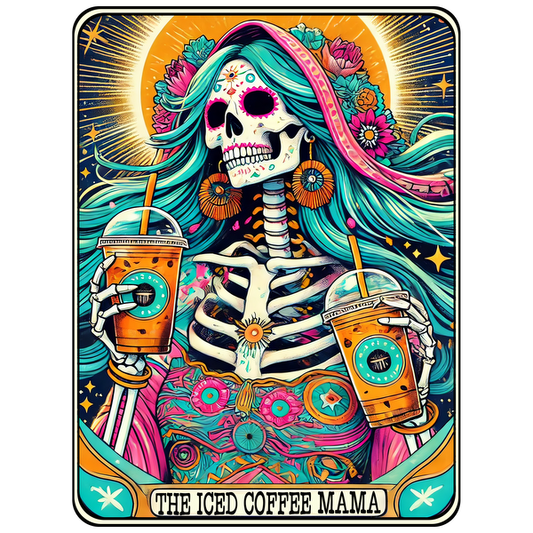 Regular price From £0.75 GBPRegular priceUnit price / per£2.39 GBPSale price From £0.75 GBPA vibrant and colorful illustration of a skeleton adorned with flowers, joyfully holding iced coffee drinks, capturing a lively, festive spirit.dtf regular iron