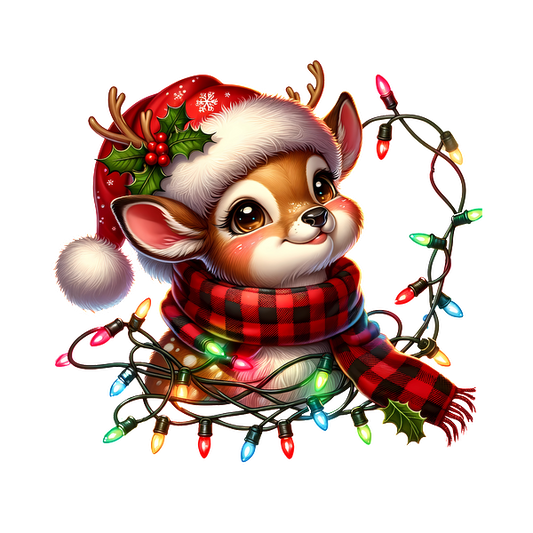 A festive, adorable deer wearing a Santa hat and a plaid scarf, surrounded by colorful Christmas lights and holly. heat press transfers