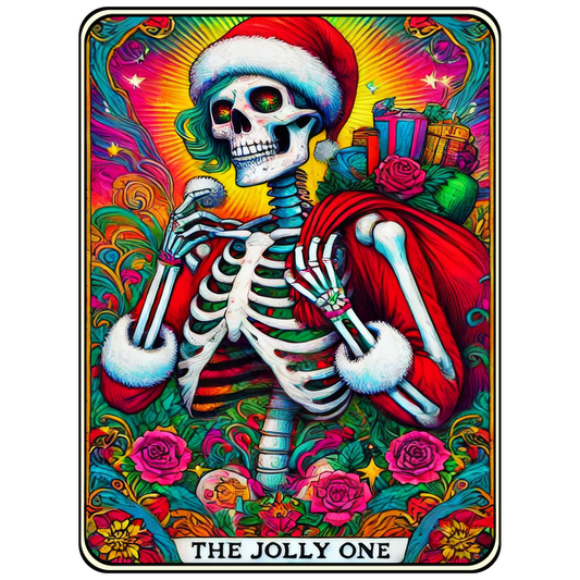 A vibrant, colorful illustration featuring a skeleton in a Santa hat, adorned with roses and gifts, titled "The Jolly One."dtf regular iron