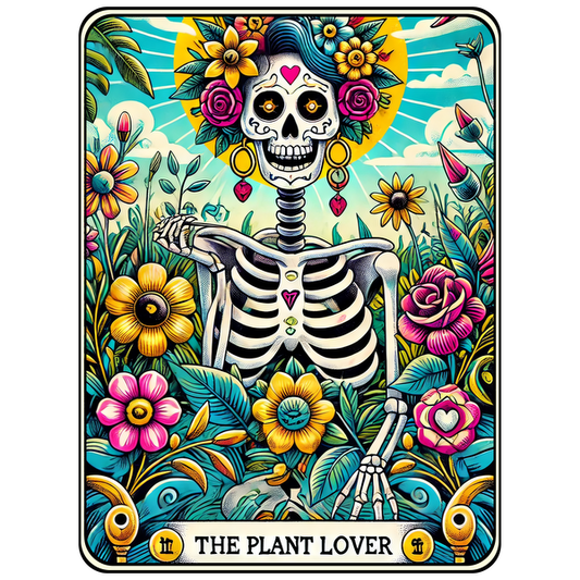 Celebrate life with this vibrant and whimsical illustration of a skeleton surrounded by colorful flowers, titled "The Plant Lover." dtf transfers