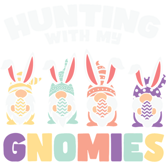 Celebrate the holiday spirit with this cheerful design featuring colorful gnome bunnies and the playful phrase "Hunting with my Gnomies."DTF Transfers