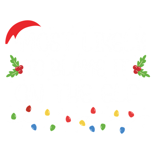 Celebrate the festive spirit with this playful "Most Likely to Blame It on the Elf" design, featuring holiday lights and decorations.DTF Transfersdtf regular irondtf regular iron