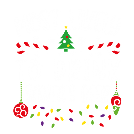 "Humorous festive design featuring 'Most Likely to Drink Santa's Beer' with playful graphics like candy canes and Christmas lights."DTF Transfers heat press transfers heat press transfers