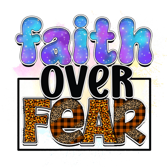 A vibrant and inspirational graphic design featuring the phrase "Faith Over Fear" in playful, colorful lettering with animal print accents.DTF Transfers