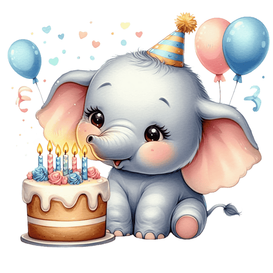 Celebrate with this adorable cartoon elephant, wearing a festive hat next to a birthday cake with colorful candles and balloons!DTF Transfers