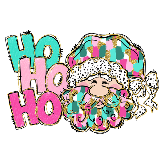 A whimsical illustration of a cheerful Santa with a colorful hat and playful "Ho Ho Ho" text, perfect for holiday cheer!DTF Transfers