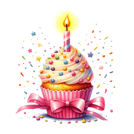 A vibrant birthday cupcake topped with creamy frosting, colorful sprinkles, and a lit candle, adorned with a pink bow.DTF Transfers
