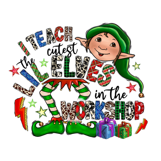 A whimsical holiday design featuring an elf, vibrant colors, and playful text stating "I teach the cutest little elves in the workshop."DTF Transfers