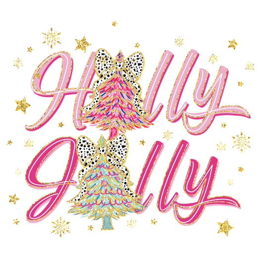 A colorful and festive design featuring the words "Holly Jolly" with vibrant Christmas trees and sparkly stars.DTF Transfers